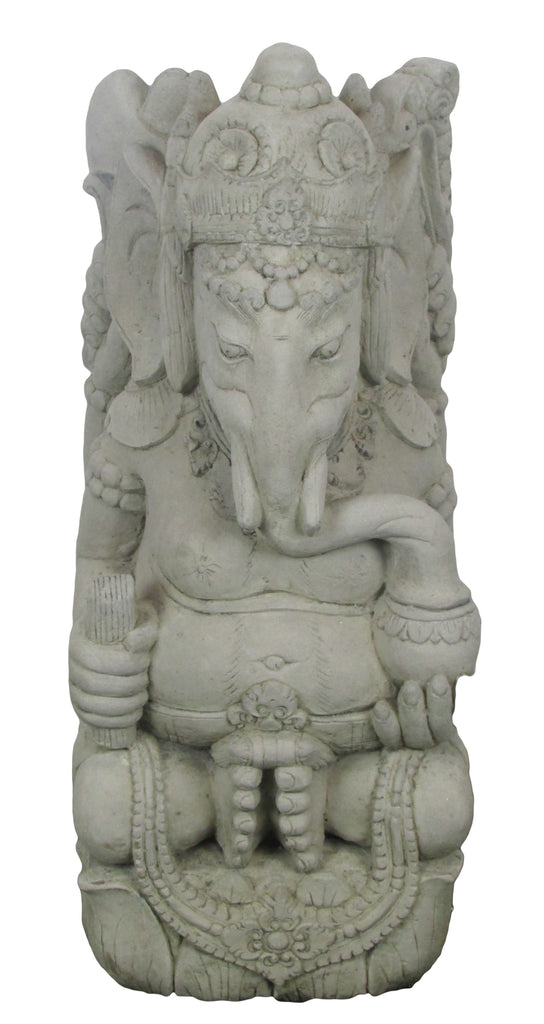 This stone garden ornament is Ganesha who is a Hindu god. He is the God of wisdom, the lord of good fortune and is also known as the remover of obstacles. Ganesha's elephant head makes him easy to identify.
